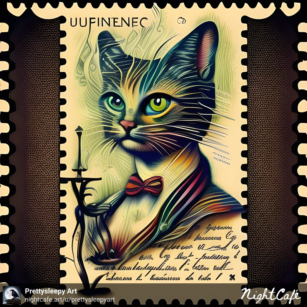 “postage stamp style: kitty cat portrait with vivid detailed amazing cat eyes, hyperdetailed pretty whiskers, H.R Giger, Vladimir Kush, fantasy, Metaphorical Realism. fluffy magical persain cat in postage stamp style. on a letter, on a postage stamp: on a letter, on a postage stamp” Weight:1.3