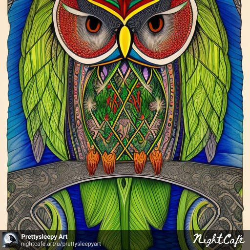“Illustrated Gaelic leafy FolkArt symmetrical owl, deep color, Vivid colors of line work, generative ornate intricately bold line-work lines running parallel Twisting And turning, hyperdetailed Bold smooth colored crayon drawing, H.R. Giger”