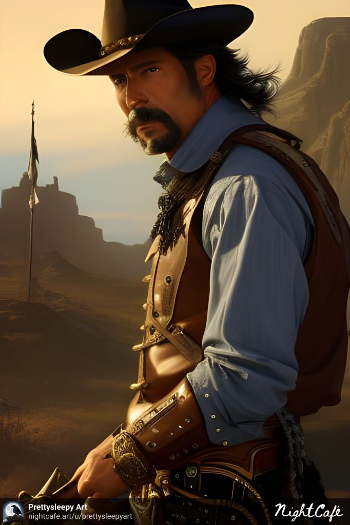 “wild west cowboy, wearing vest, chaps, stetson hat, Gustave Doré, Greg Rutkowski, Keith Thompson, Scott M Fischer, head and shoulders portrait, 8k resolution concept art portrait by Greg Rutkowski, Artgerm, WLOP, Alphonse Mucha dynamic lighting hyperdetailed intricately detailed Splash art trending on Artstation triadic colors volumetric lighting”