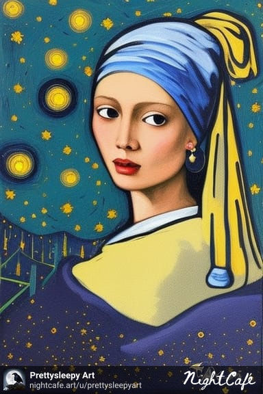 “The Girl With A pearl Earring, mixed media, complimentary color, the starry night background, in the art style of Kaethe Butcher, Pierre-Auguste Renoir, Gaelic leafy FolkArt Folklore”