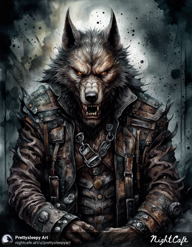 “heavy-metal werewolf, inspired by Klaus Wittmann, Bastien Lecouffe Deharme, Alex Alemany. Detailed textured mixed media artwork watercolor, ink. hyperdetailed. Epic painting.” Weight:2.3