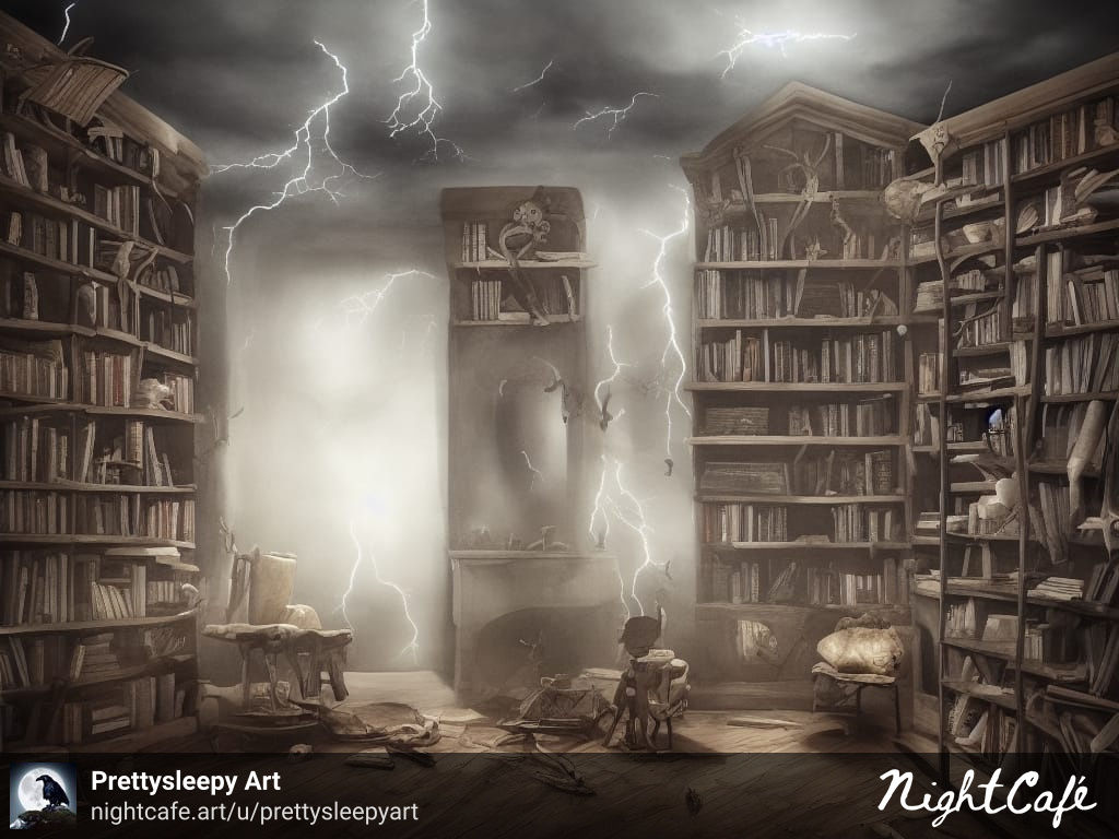 “inside an old house with elements of Lightning and storm clouds, in foreground is a skull wall, eerie mood and feel, 8k, HDr, smooth digital artwork, deep complementary colors, bookshelves covering the dark walls, a beautiful watercolor painting”