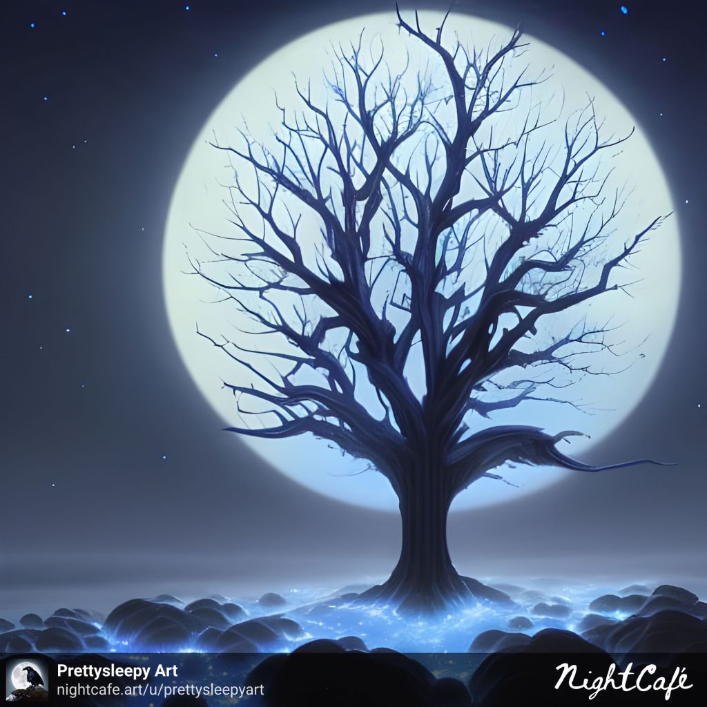 “hyperdetailed thrilling night tree, moon in the branches, cinematic brilliant multitude of brilliant stars, massive huge moon, lovely incandescent blue of the twilight sky, 12k resolution, detailed deep color oil painting, detailed matte painting, fantastical, splash screen, fantasy, trending on Artstation Unreal Engine 5, Eldritch by Greg Rutkowski”