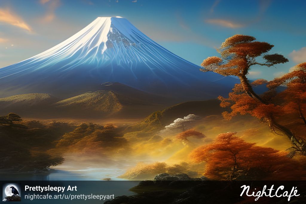 “Mount Fuji, astounding hyperdetailed landscape painting, photorealistic 16k resolution fantasy masterpiece ornate Handiwork intricately detailed, Serge Marshennikov, Luis Royo, Anna Dittmann, Peter Mohrbacher, hyperrealistic, hyper detailed, incredible composition, Mind-Boggling Celestial art”