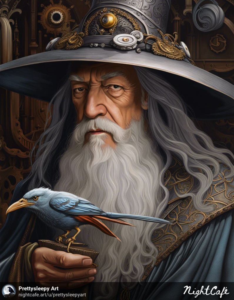 “Gandalf the Grey, With his long gray robes, wide-brimmed pointed hat, and immense magical power, Centered Photorealistic Portrait of an ornate mechanical little bird, Close-up, detailed matte painting, deep color, fantastical, complementary colors, fantasy concept art, photorealism” Weight:1