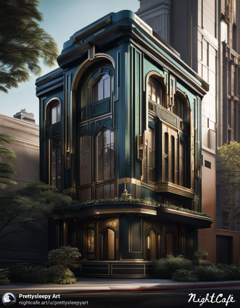 “portrait of a fancy ornate art deco building. Lacquering compliment the modern lines of Art Deco style like obsidian, jade, and ivory. with sleeker, more stylized chrome and stainless steel characterized by clean lines and modern clean, sleek, and modern aesthetic. a style rooted in luxury” Weight:1.8