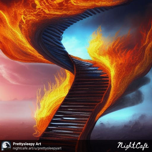 “12 k resolution digital art, intricately detailed endless infinity stairway stairs to hell, engulfing fire-storm, fluid perfect illustration, Biopunk castle in the cloudscape, Deep Colors, Monster Mythological, Bizarre Rays from between the flames, Ultra Detailed Ghostly Backlighting, Epic cinematic brilliant stunning intricate meticulously detailed dramatic atmospheric maximalist digital matte painting”