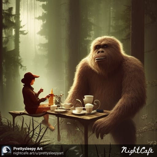 “epic Insanely detailed cinematic digital illustration of a sweet adorable bigfoot, having tea with elderly person, peaceful atmosphere, Deep Color, intricate and hyperdetailed painting by Ismail Inceoglu and Dan Witz CGSociety fantasy art album cover art 8k resolution, sharp focus”