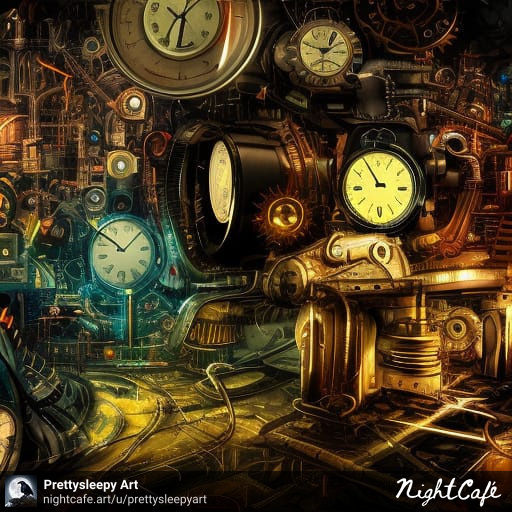 “Clocks, clockpunk, clockcore, the most huge and detailed Industrialpunk time-machine ever seen, award-winning masterpiece, digital illustration, digital artwork, hyperdetailed digital painting, unique composition, complex, 8k resolution concept art HDR, Ochre Accents Compliment This Refined Interplay Of Colours, dynamic lighting”