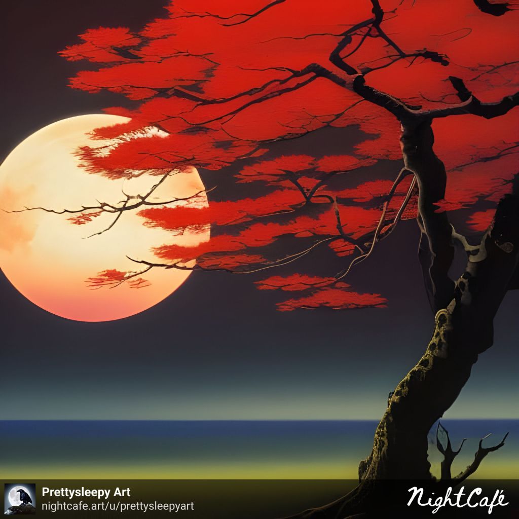 Prompt: one huge moon. Steamy foggy summer. (Gothic Horror) (spooky) Love turned to doom, betrayal’s fizzy sting, a wiggly branched tree. detailed matte painting, deep color, abstract art complementary colors fine details. Weight:1