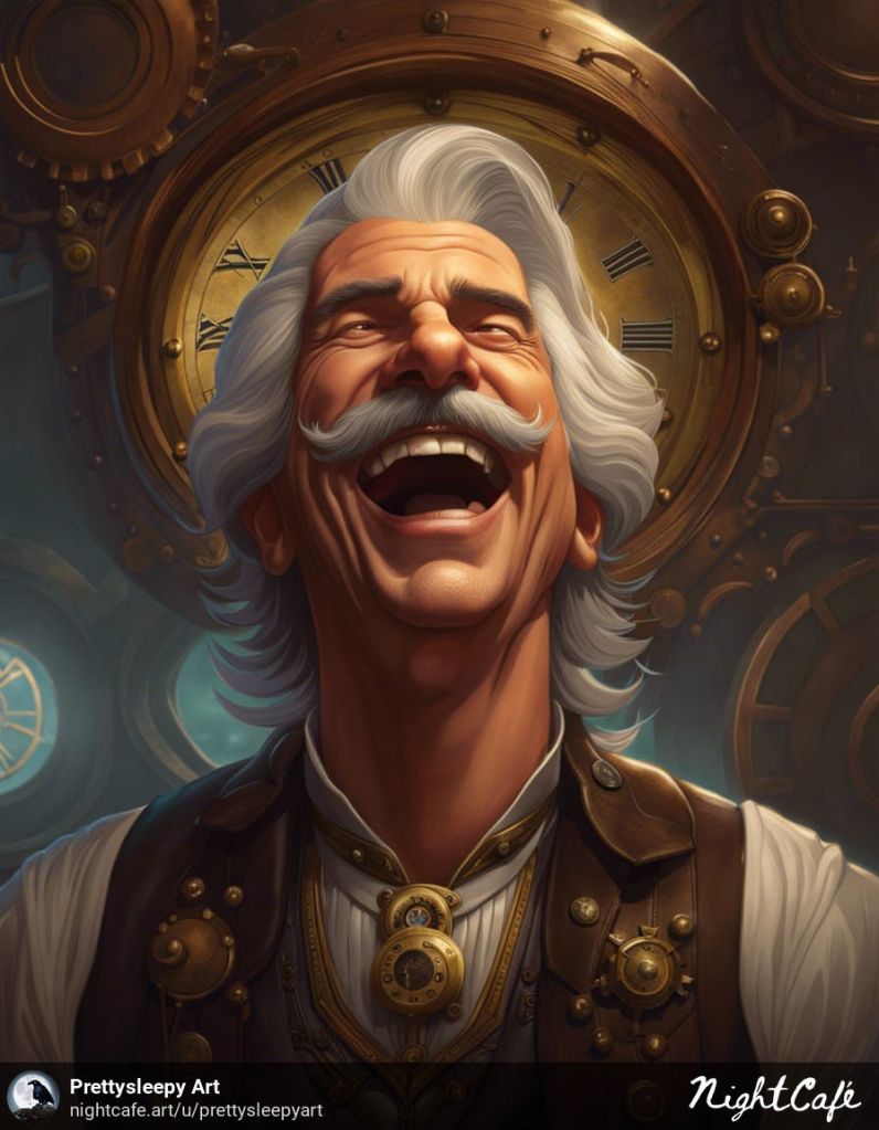 “Laughing with head thrown back in glee. high quality steampunk portrait of a happy man played by Sam Elliott, amazing background, by tomasz alen kopera and peter mohrbacher, sharp focus, clear, vibrant, denoised, intricate artstation, 8k, steampunk clock render engine” Weight:1.8