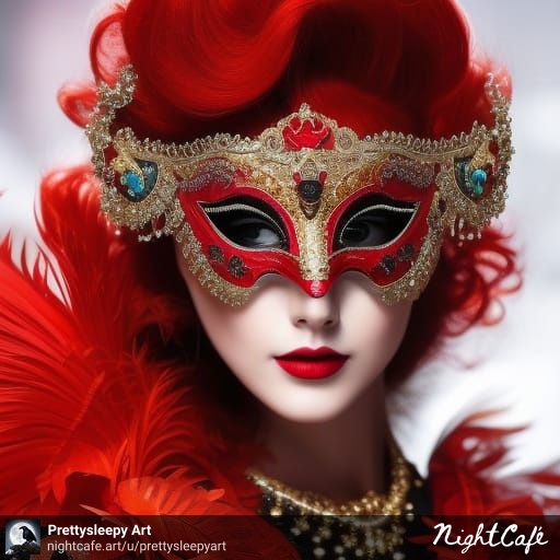 “wearing a venetian masquerade mask that covers the eyes, Full body portrait of woman red dress, fashion and charming and dreamlke, red hair, art by artgerm, detailed painting, deep color,, intricate detail, splash screen, complementary colors, fantasy concept art, 8k resolution trending on Artstation Unreal Engine 5” Weight:1