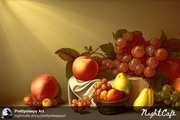 “dramatic vintage Still Life with Fruit on a Stone Ledge, a painting, Italian Baroque inspired by master Michelangelo Merisi da Caravaggio, dynamic lighting detailed matte background sunshine rays”