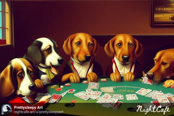 “Dogs Playing Poker, in the style of Cassius Marcellus Coolidge, hyperdetailed anthropomorphized dogs seated around a card table, Masterpiece painting, 16k resolution popular culture art”