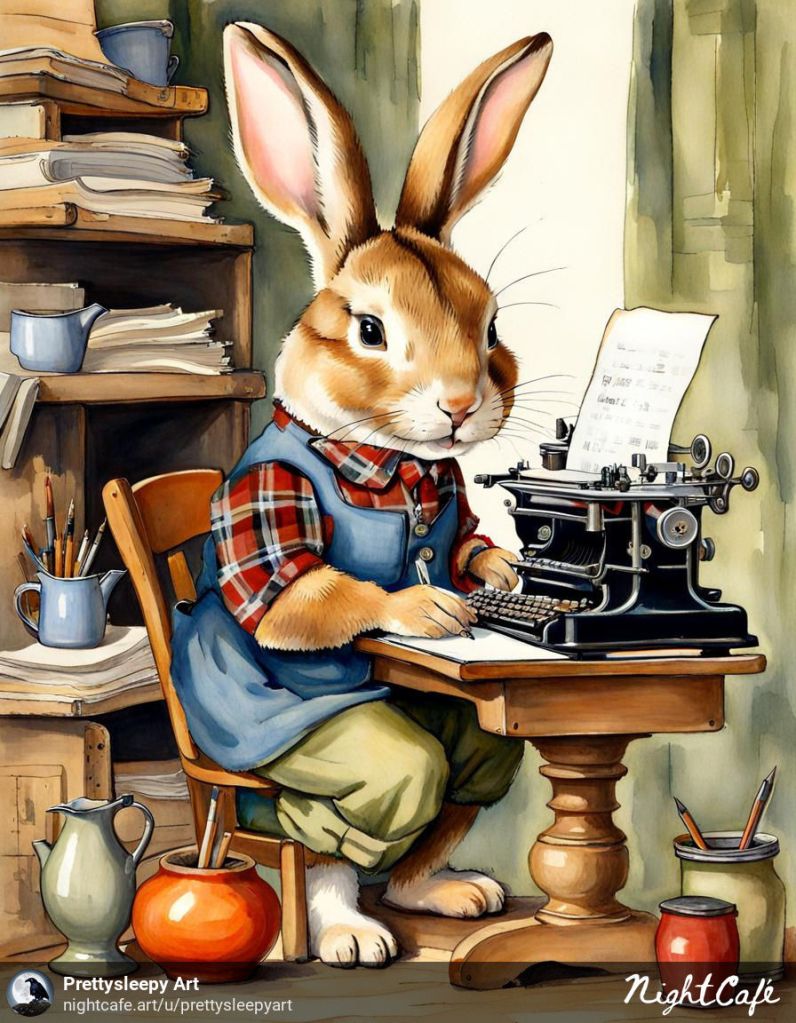 “Create a whimsical adorable painting of a rabbit writing at a typewriter wearing a Plaid flannel shirt. An illustration by Beatrix Potter, & Richard Scarry & Jean-Baptiste Monge. artistic painting cute adorable professional picture” Weight:1