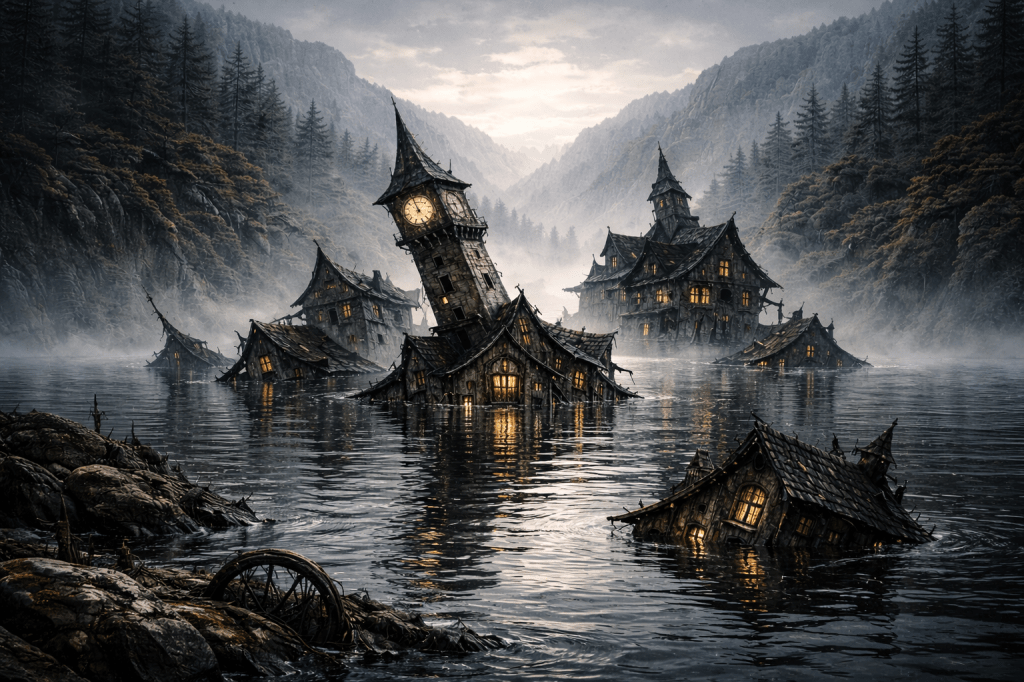 Old town sinking into a lake, rendered with mysterious exaggerated scale, whimsical unease, eerie stillness, dreamlike atmosphere, haunting architecture, surreal reflections, moody waterlogged streets, and immersive dark-fantasy storytelling. Stylized, cinematic, and evocative. Photo-real style.