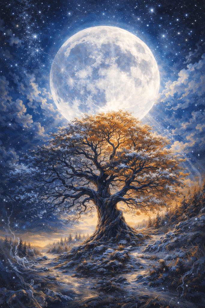 Change of season scene featuring a night tree under a massive moon, with cinematic atmosphere, intricate embellishment, and extremely fine detail. A twilight sky glowing with lovely incandescent blue tones and filled with a multitude of brilliant stars. Render as a deeply colored, textured oil painting with rich seasonal mood, splash-art energy, unique intricate design, complementary colors, stylized cartoon-paint overlay, retro-futurist cinematic concept-art sensibility, nostalgic sci-fi landscape mood, painterly character-design polish, epic matte-painting grandeur, and polished 3D CG realism. Ultra-detailed, 8k–12k quality.