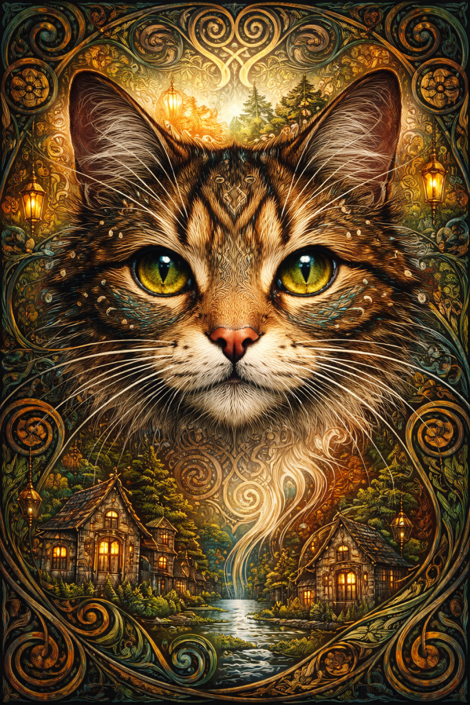 Cat art. Speed-paint of a cat face. Gaelic-inspired city folk-art with generative patterning.