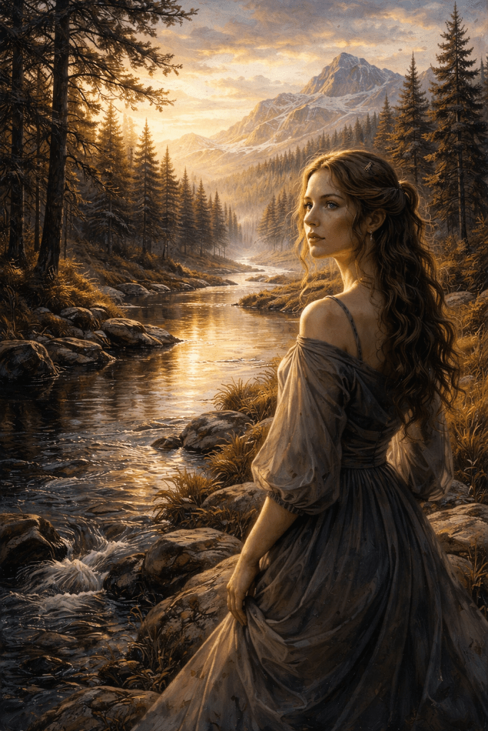 River through the pines. with serene northern wilderness mood, luminous natural landscapes, and stylized portrait realism with a dreamlike, uncanny elegance. Rendered as a richly textured oil painting with award-worthy detail, cinematic lighting, polished surreal atmosphere, high-end game-engine realism, and ultra-detailed 8k quality.