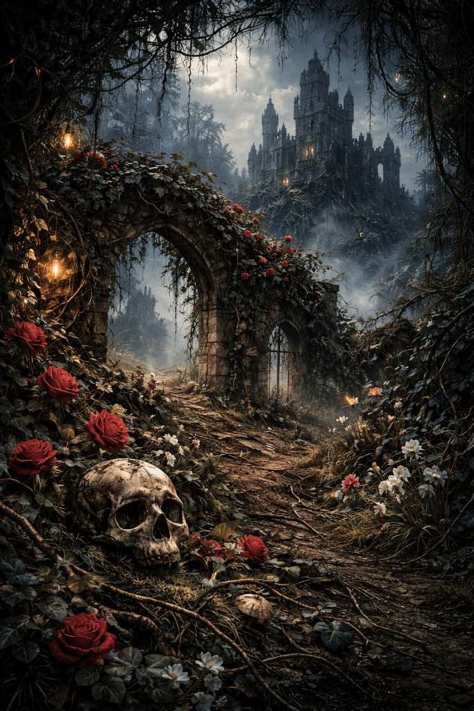 Central American gothic woodland scene with ivy, flowers, twisting vines, skull, thorns, and dirt, set in a dark and moody atmosphere. Fog drifts around crumbled castle ruins as wild flowers and overgrown vines reclaim the stonework. Digital illustration with detailed painterly rendering, atmospheric lighting, dramatic environmental storytelling, lush overgrowth, eerie romantic decay, and sweeping retro-futurist fantasy illustration sensibility. Moody, cinematic, richly textured, highly detailed.