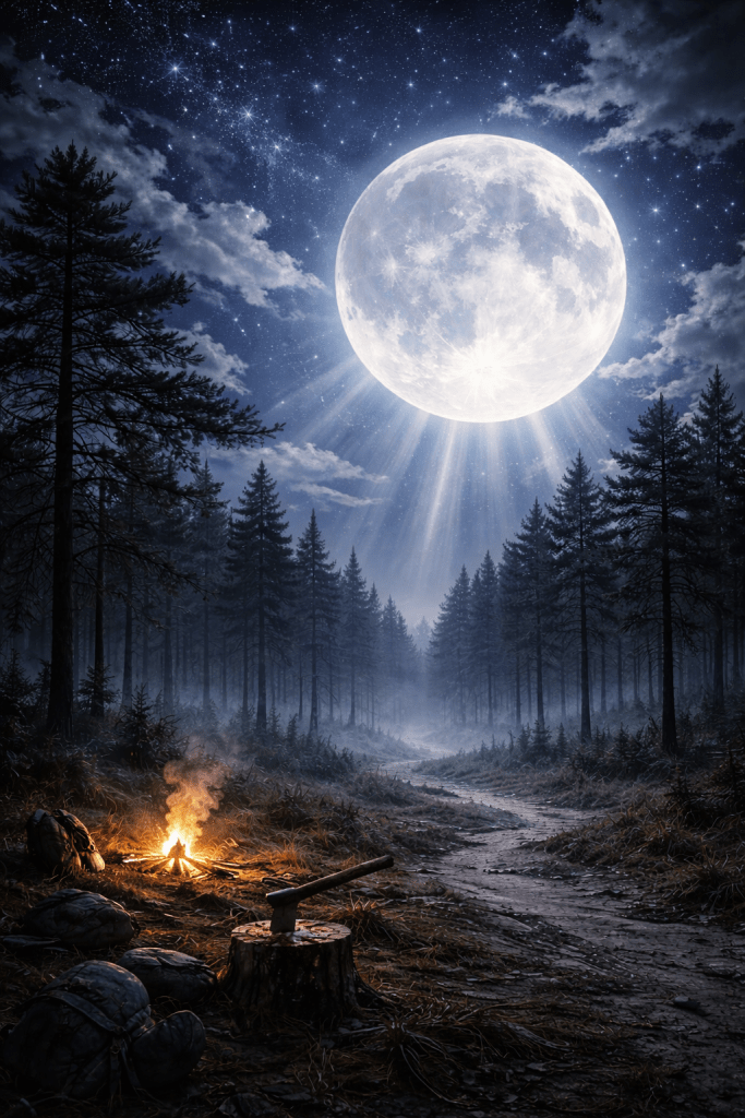 Pine barrens at night beneath a moonlit sky, with a massively huge beaming full moon, stars visible behind a few drifting clouds, and shafts of moonlight breaking through the darkness. Render as award-winning, smooth, fluid digital artwork with magnificent color, cinematic horror atmosphere, eerie slasher-inspired campfire dread, moody woodland suspense, masterful environmental storytelling, and hyperdetailed finish. A masterpiece of epic proportions.