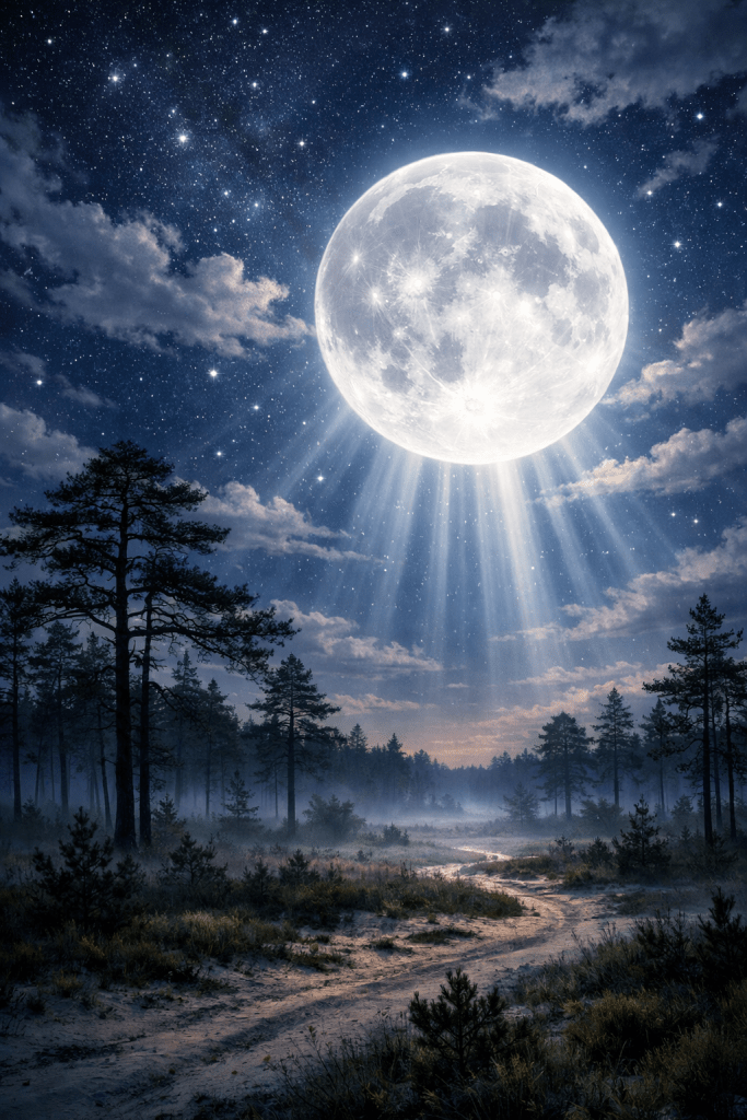 Ominous pine barrens at night beneath a moonlit sky, with a massively huge beaming full moon, stars scattered behind a few drifting clouds, and radiant beams of moonlight cutting through the darkness. Create smooth, fluid, highly polished digital artwork with magnificent color combinations, cinematic atmosphere, biomechanical unease, eerie dark-fantasy whimsy, intricate organic ornamentation, surreal alien textures, gothic storybook mood, shadowy environmental storytelling, and mystical illustrative detail. Hyperdetailed, epic in scale, masterpiece-quality digital painting.
