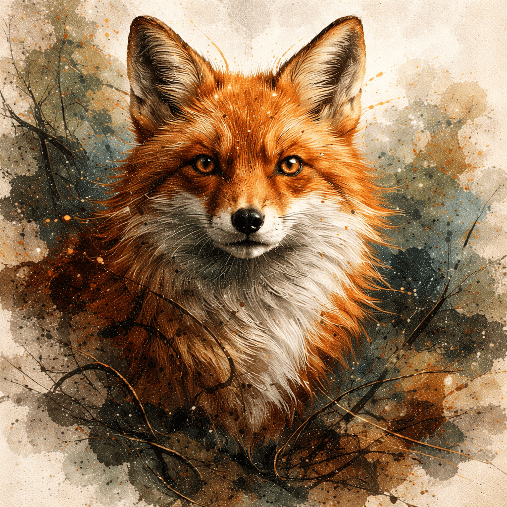 Fox rendered as mixed-media concept of oil, watercolor, eggshell texture. expressive naturalistic and immersive.