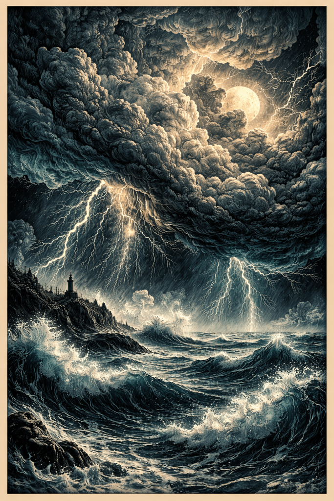dendritic poster-art of the sea. massively huge storm clouds. surreal bold composition, and haunting luminous detail.