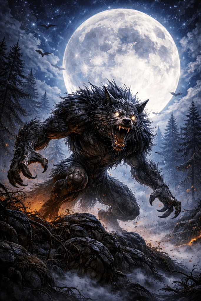 Original, captivating illustration featuring a hyperrealistic full moon and a hyperdetailed werewolf as the focal subject. Epic cartoon-inflected fantasy-horror scene with gorgeous complementary colors, dramatic atmosphere, and maximalist digital matte-painting sensibility. Intricate, meticulously detailed composition with visible expressive brushstrokes, striking lighting, perfect balance, and an 8k-quality finish. Polished, atmospheric, vivid, and visually powerful.