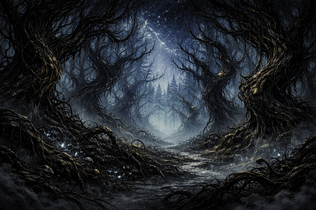 Overwhelming, elongated-expressionist cartoon illustration of a dramatic twisted forest nightmare with eldritch branches. Darkwave fantasy atmosphere, hyperdetailed forest depth, dense undergrowth, creeping vines, and thrilling surreal menace beneath a multitude of brilliant stars. Rich deep color, wet foggy textures, stylized cartoon mist, eerie emotional distortion, painterly gothic-romantic mood, and immersive nightmare-fantasy composition. 8k-quality, highly atmospheric, intricate, and haunting.