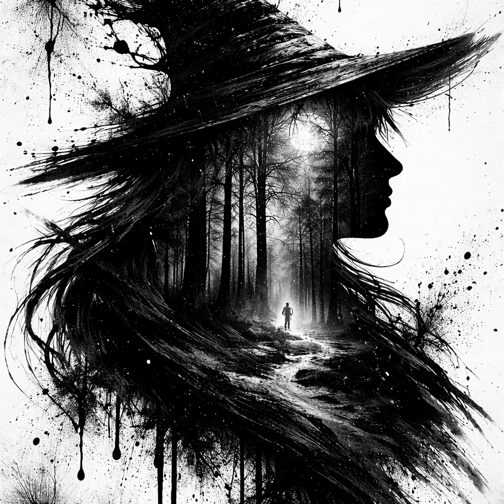 Double exposure photography of trees forming the silhouette inside a witch’s head, rendered in stark black-and-white with a negative-image effect. Use expressive speedpainting techniques with large, energetic brush strokes, ink-heavy horror illustration aesthetics, graphic-novel contrast, eerie surrealism, elongated organic textures, moody shadow layering, vintage dark-fantasy cover design, atmospheric paint splatter, hyperdetailed composition, masterpiece-quality magazine cover art, 8k resolution, dramatic and unsettling horror tone.
