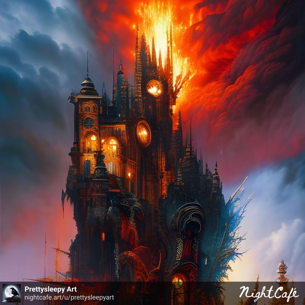 “tower of doom on hell night. hyperdetailed. intricately detailed, complex. Greg Rutkowski. Mark Brooks Richard Scarry. painted thick oil paint and outlined in white, carved with a pallet knife. outlined again in black showing texture. sharp. hyperdetailed. 8k resolution. trending on artstation. deep color. glowy.” Weight:1