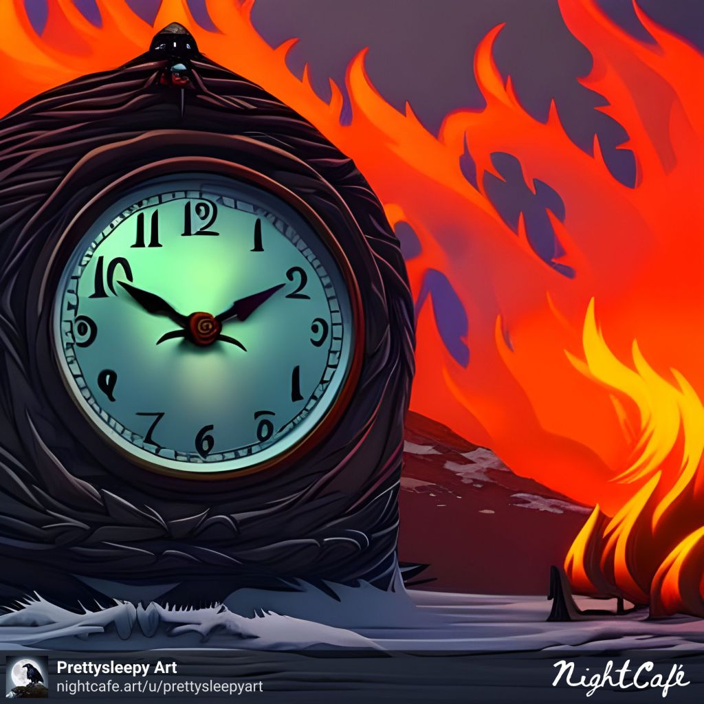 “A clock that is surrounded by fire. digital illustration detailed painting. centered. in the art style of the abominable snowman” Weight:2.3
