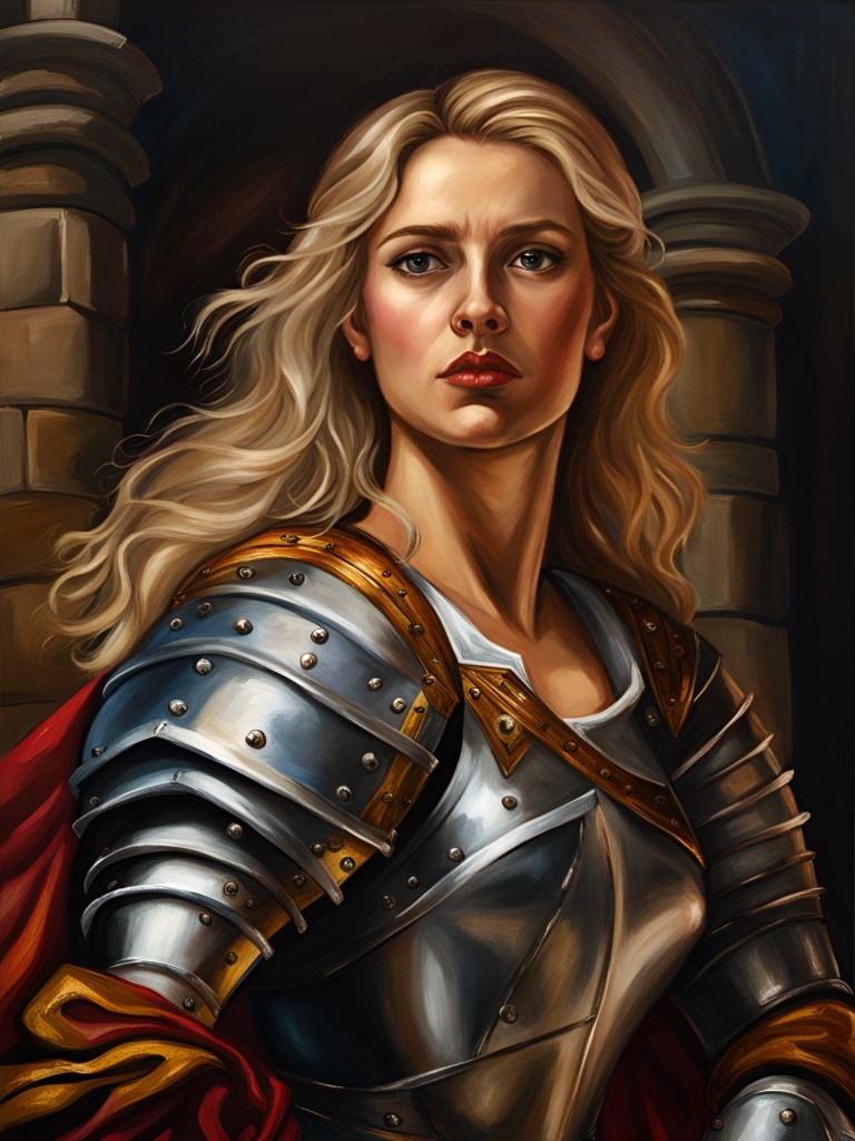 14. Dim Lit Castle Ready For Battle Hd, Hyper Realistic, 10k Resolution, Epic, Bold, Brave. gypsy in armor, a pretty blonde woman. El Greco, Spanish Renaissance