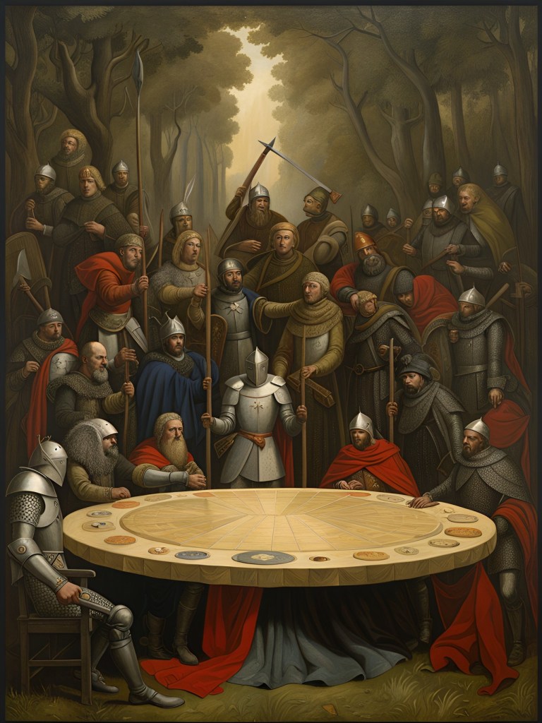 - King Arthur And His Mediaeval Knights At The Round Table Oil On Canvas Impasto Highly Detailed Realistic 8k Hdr Photo In The Style Of Micheal Garmash