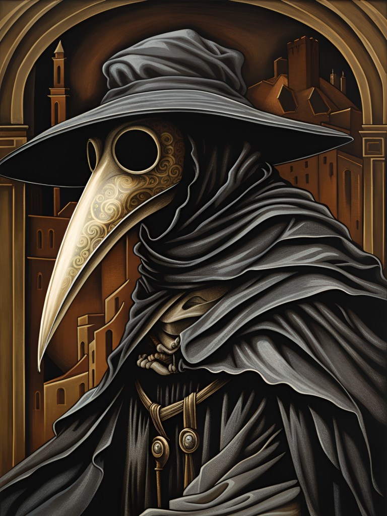 19. drama and danger Medieval Plague Doctor, Kay Sage American Surrealist artist, fantasy, Brothers Hildebrandt fantasy, Mixed-Media Photography, Noriyoshi Ohrai And Jeremy Mann, Masterpiece, Chiaroscuro Fantasy Concept Art, Cel-Shaded, Black outlines, William Blake mystical worlds full of drama