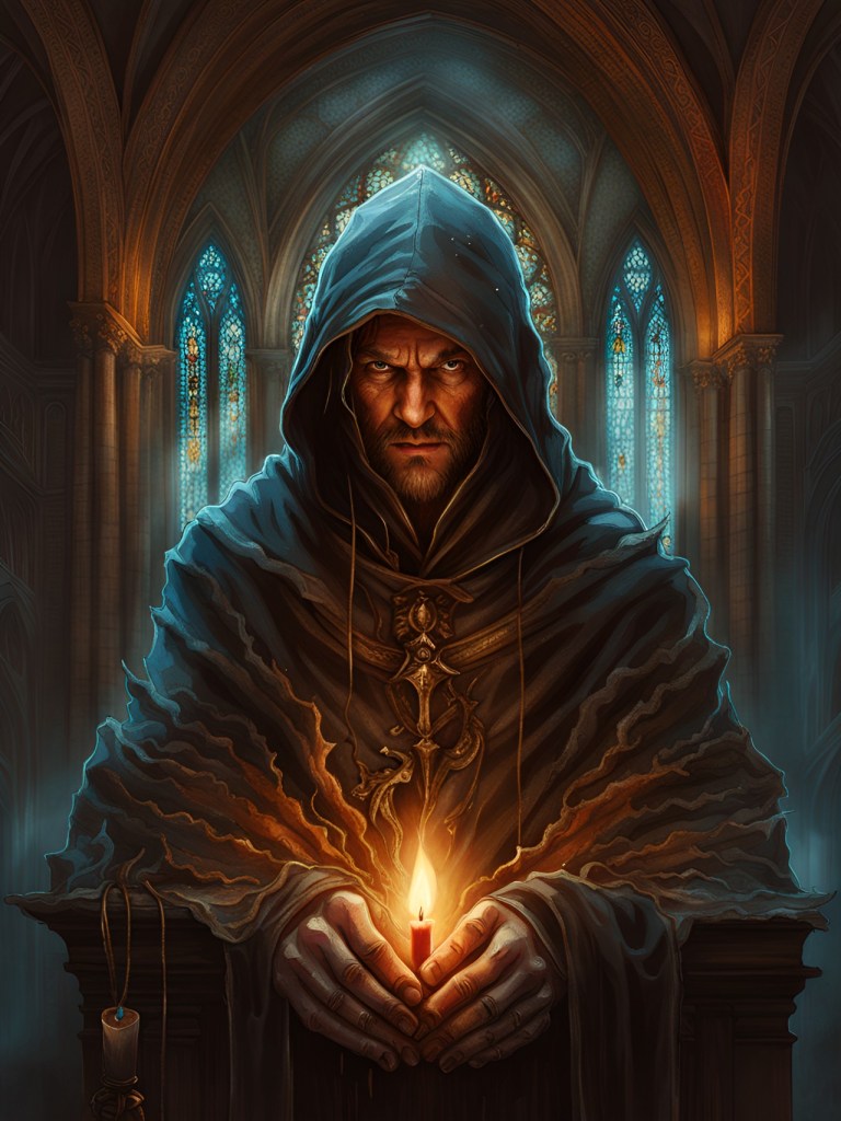 11. Hooded Monk In A Chapel, Candles, Hyperdetailed Intricate Photoillustration Volumetric Lighting Dreamworks Morbid Carne Griffiths And Gil Elvgren Gothic Art Photorealistic Carne Griffiths Krenz Cushart And Akihiko Yoshida 8k Concept Art Portrait Greg Rutkowski, Artgerm, Wlop, Alphonse Mucha Splash Art, Dark Souls