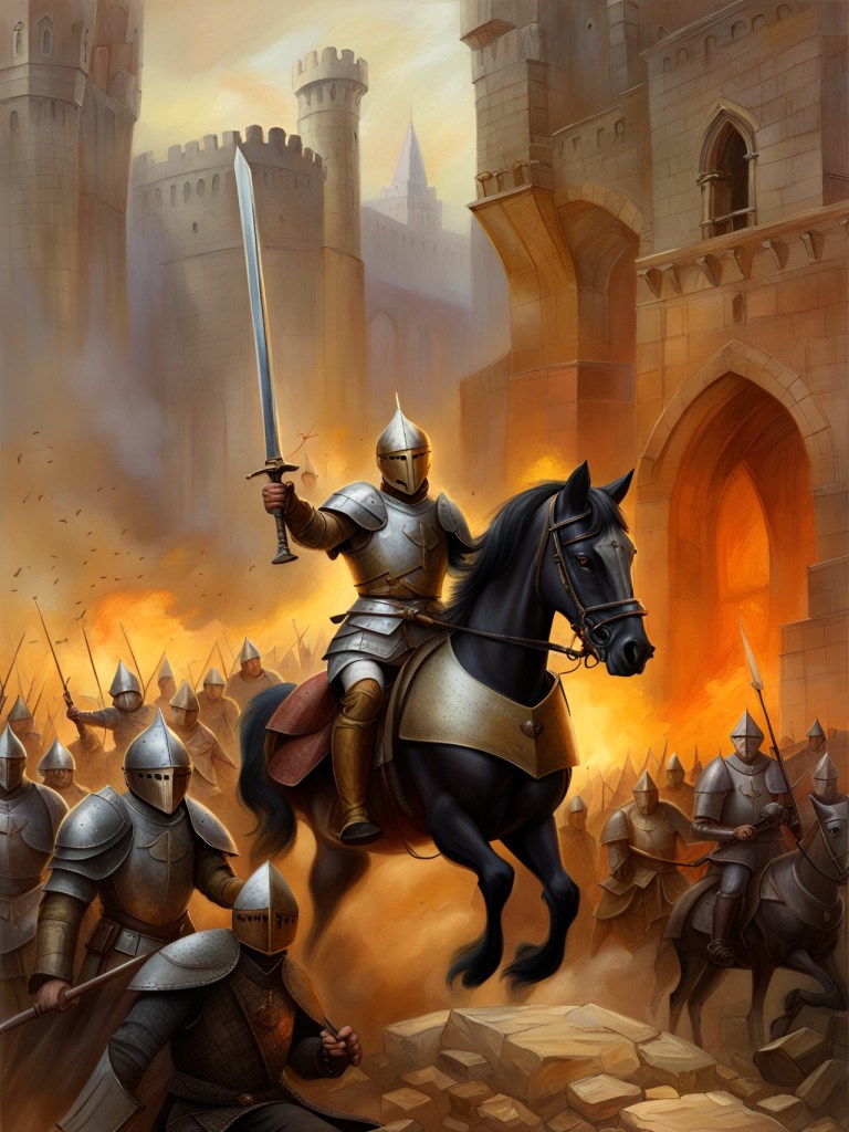 17. Knight Surround By Other Knights In Battle Near Castle Epic Cinematic Brilliant Stunning Intricate Meticulously Detailed Dramatic Atmospheric Maximalist Digital Matte Painting Oil Painting By James Gurney Tom Roberts, Australian impressionism Bojan Koturanovic, Kelly Freas, illustrator, fantasy