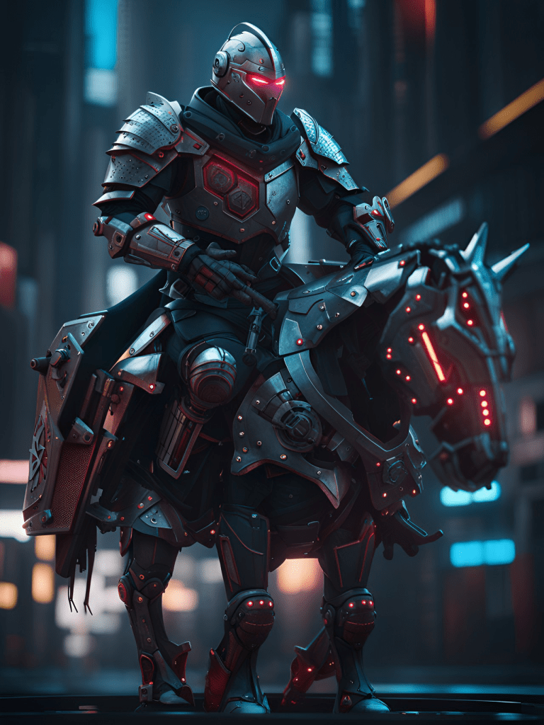 13. Cyberpunk Templar Knight On Horseback, 8k Resolution, Hyper Detailed, Dynamic Lighting, Volumetric Lighting, Intricate Mech Details, Ground Level Shot, Cinema 4d, Behance Hd, Polished Metal, Unreal Engine 5, Rendered In Blender, Trending On Artstation, Epic, Cinematic Background, Dramatic, Atmospheric